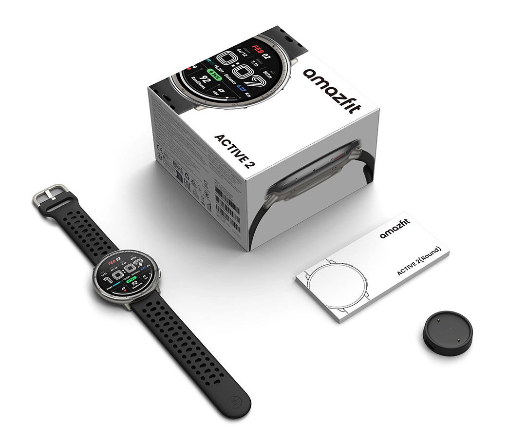 É por isso que o seu Amazfit Active 2 vem embalado¹⁵ em materiais 100% recicláveis, acompanhado de uma base de carregamento (compatível com USB Tipo-C) — mas sem o cabo, para reduzir o desperdício do nosso lado e evitar fios extras na sua casa.